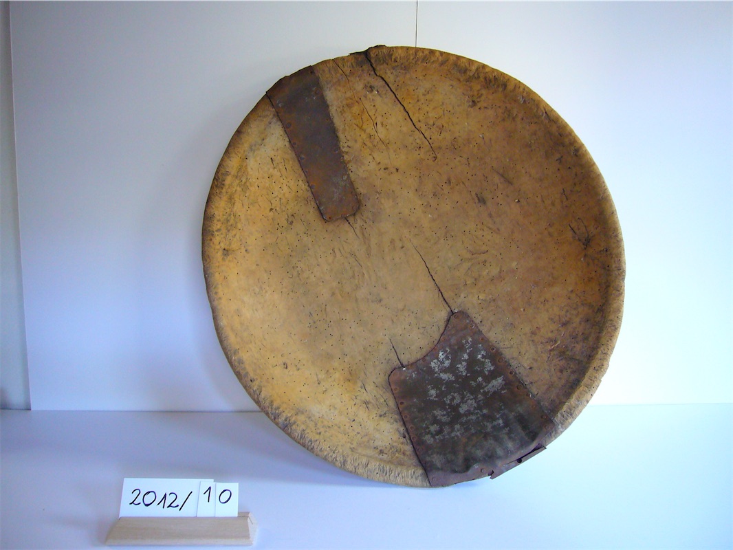 Die Risse in der großen Holzschale sind mit Blech geflickt, so konnte die Schale weiterverwendet werden. © Museum Tuppenhof -