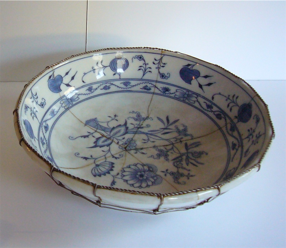 Eine gesprungene Porzellanschale ist auf der Unterseite mit Draht stabilisiert worden. © Museum Tuppenhof -