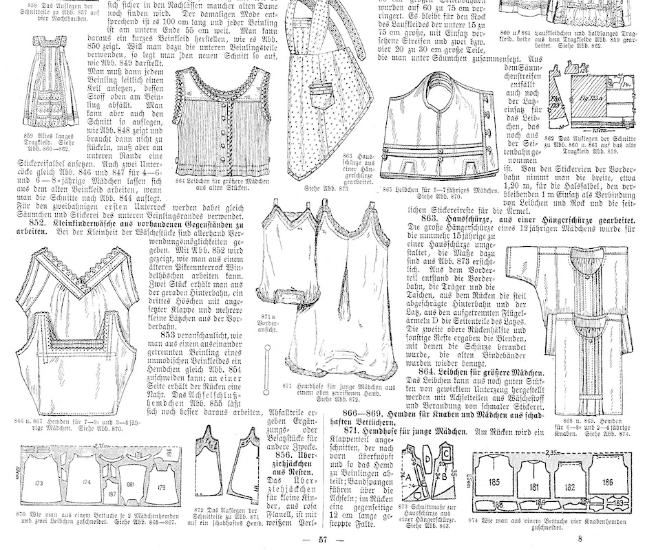 Anleitung mit Schnittmustern zur Anfertigung von Kinderkleidung aus zerrissenen Hemden und alten Bettlaken, um 1900. © Museum Tuppenhof -