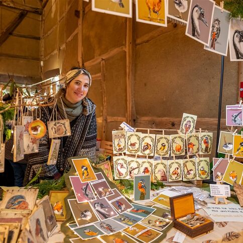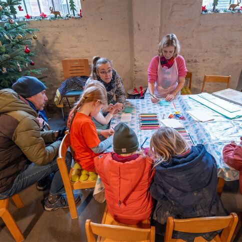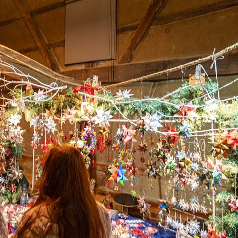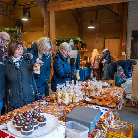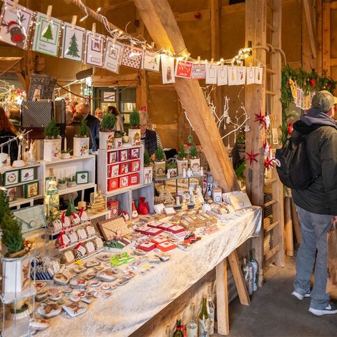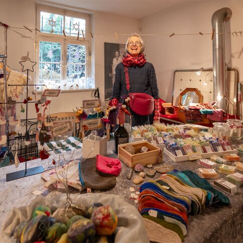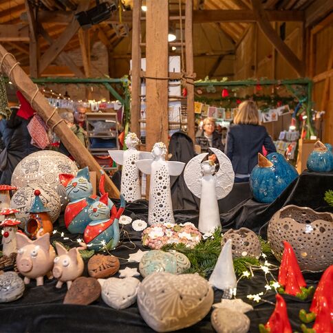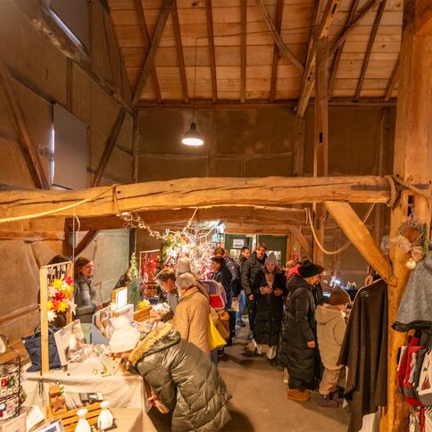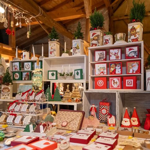 Und ist man erst einmal durch die Tür zur großen Scheune gegangen, zeigt sich die echte weihnachtliche Atmosphäre des Marktes. An liebevoll dekorierten Tischen präsentieren ausgesuchte Händler und Handwerker ihre Ware: Kreatives aus Holz, aus Papier oder aus Keramik, Dekoratives aus edlem Metall oder aus Glas, Wärmendes aus Wolle, Liköre und Pralinen, Gewürze und Duftendes… Gemeinnützige Vereine verkaufen für einen guten Zweck. Die Organisatoren des Adventsmarktes legen Wert darauf, dass keine gewerblichen Sachen angeboten werden, eine Auswahl der Händler wird Jahr für Jahr unter den Anfragen getroffen.
