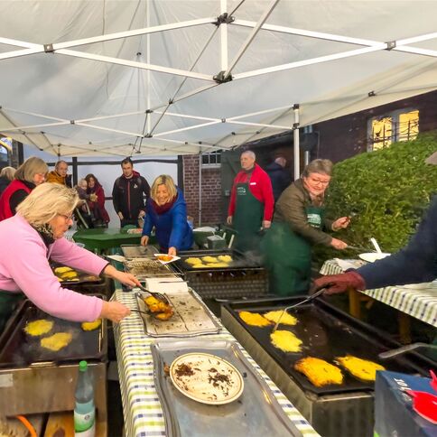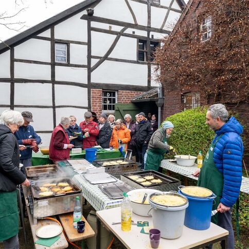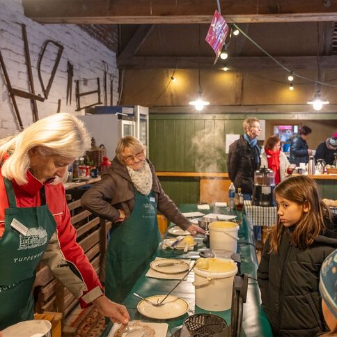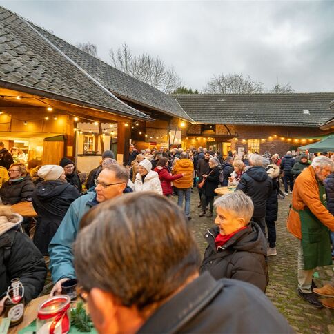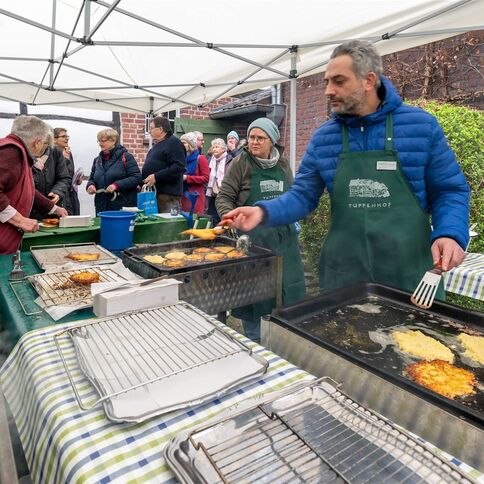 Kaum hat man die kleine Eingangspforte zum Tuppenhof passiert, schon wird man mit den Düften von Reibekuchen und Waffeln, von Glühwein, Kinderpunsch und Maronen empfangen. Lichterketten tauchen den Vierkanthof in festlichen Glanz. Runde Stehtische stehen bereit, laden dazu ein, die angebotenen Köstlichkeiten (manche behaupten, es gäbe nirgendwo so gut schmeckende Reibekuchen wie im Tuppenhof!) zu genießen.