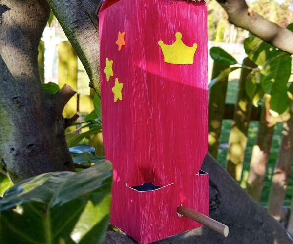 Vogelhäuschen aus Wertstoffen und Naturmaterial.