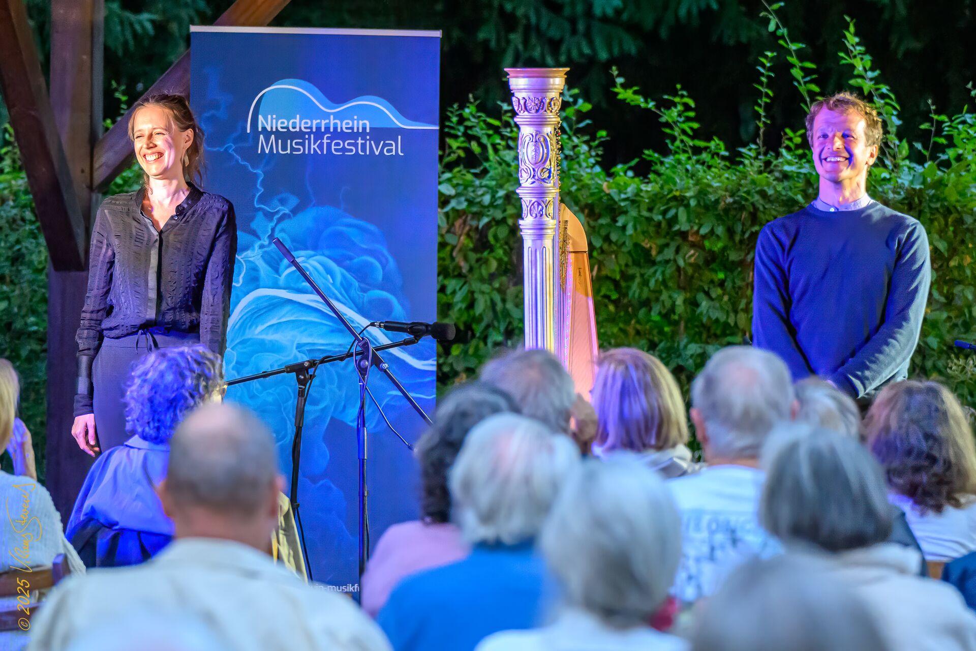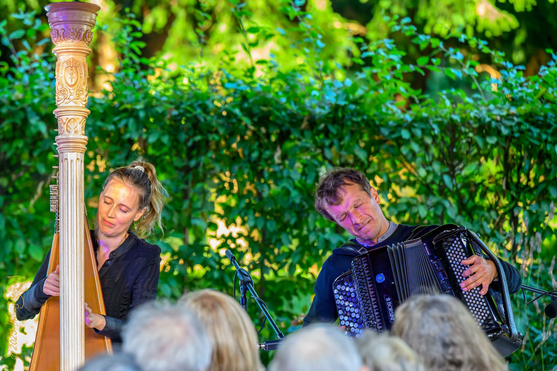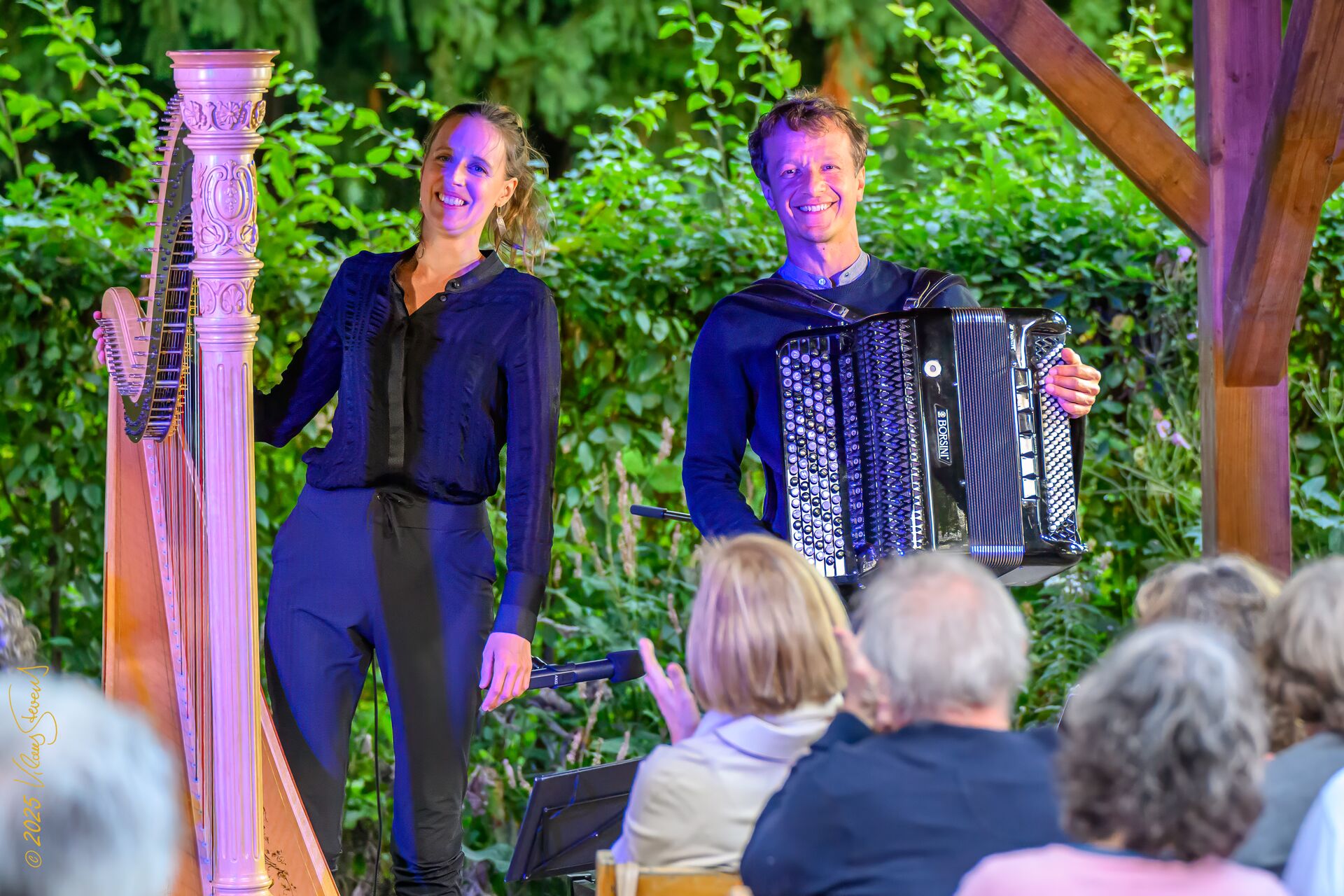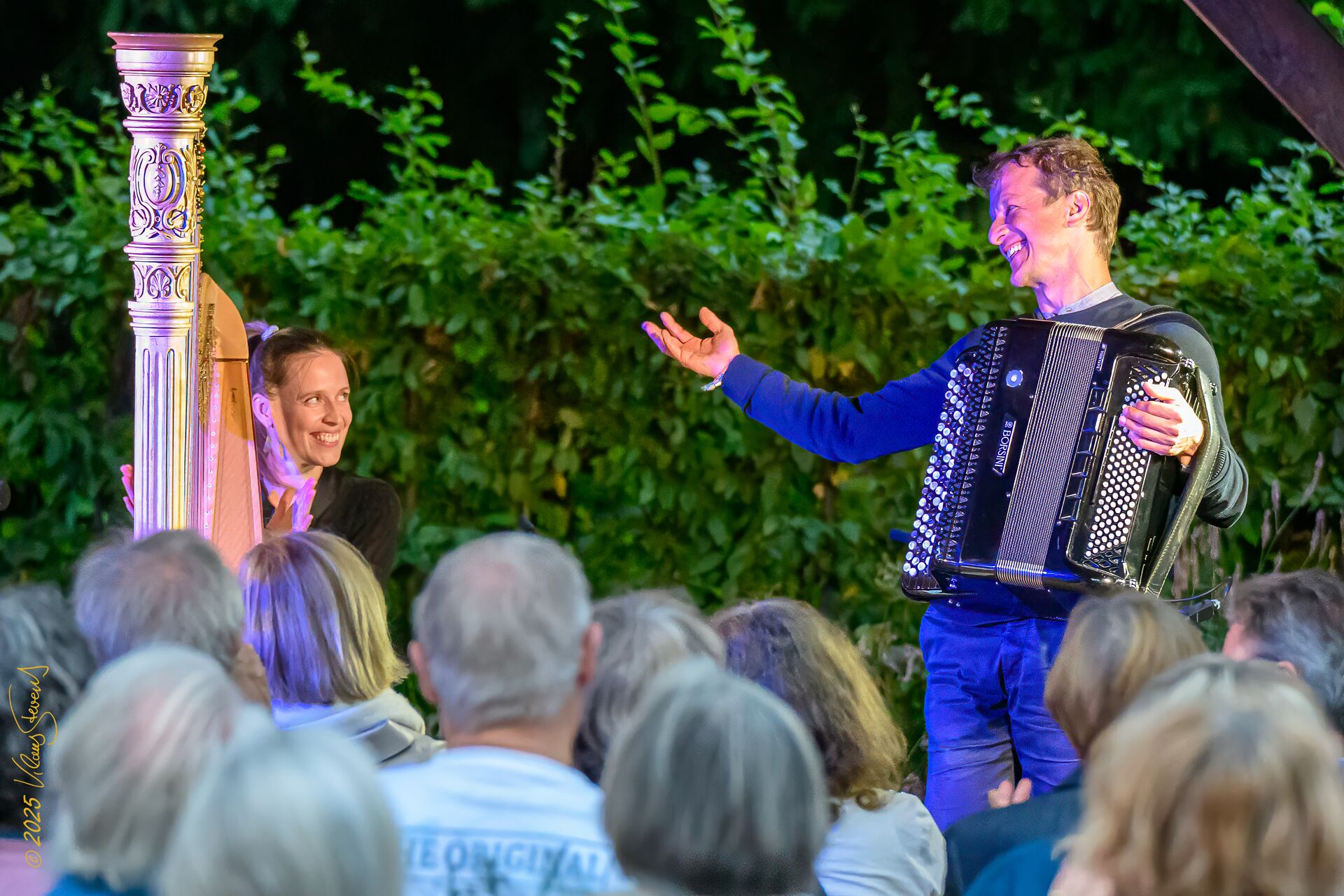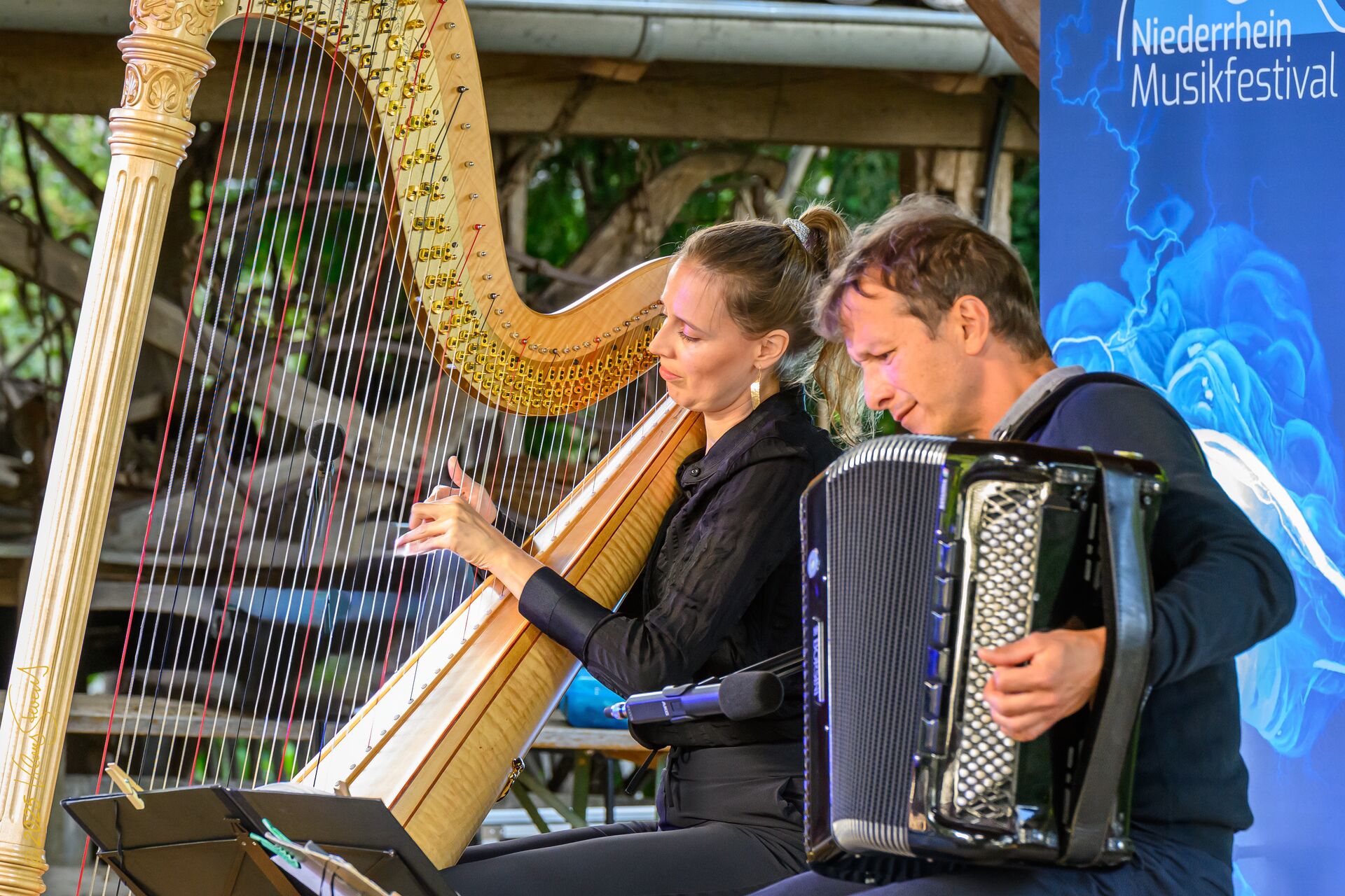 Über „ein volles Haus“ freuten sich Jürgen Rau, Geschäftsführer vom Museumsförderverein Tuppenhof und Anette Maiburg, künstlerische Leiterin vom Niederrhein Musikfestival, denn viele Gäste waren zum Konzert vom Duo Oxymoron gekommen und warteten bei bestem Spätsommerwetter auf den Auftritt der beiden Künstler im Bauerngarten. „Scented Rushes“ – "Duftendes Nichts" hieß das Programm und mit „schaurig-schöner“ Musik von Astor Piazzolla und Maurice Ravel und dem Zusammenspiel von Harfe und Akkordeon in „klirrender Stille“ begeisterten Anna Steinkogler und Valentin Butt und machten ihrem Namen alle Ehre. Seit Jahren verbindet die beiden eine enge musikalische Beziehung und der Wunsch etwas intensiv Emotionales zu schaffen. Das ist ihnen gelungen, im Schein des Mondlichts bei „leuchtender Dunkelheit“ verschmolzen Klang und Stille zu einem einzigen „unendlichen Moment“ und zu einem klanglichen Dialog der beiden Instrumente und offenbarten so den Weg zu neuen Hörgewohnheiten (bh).