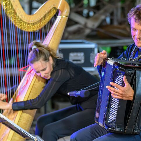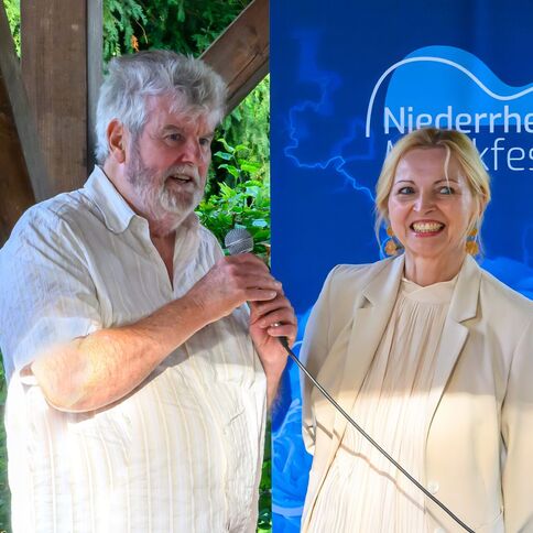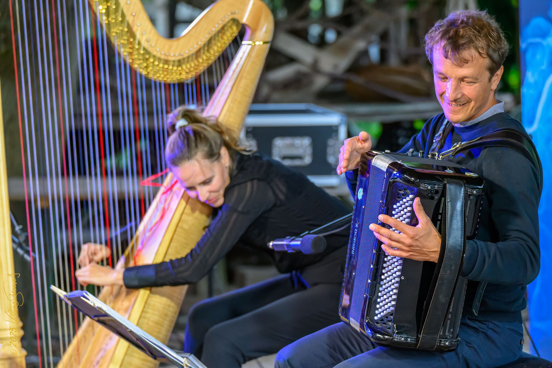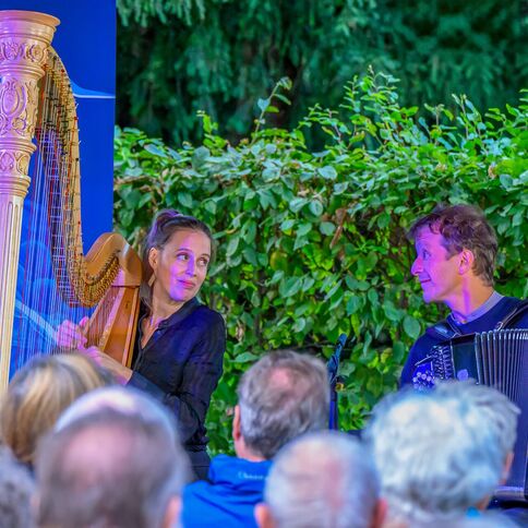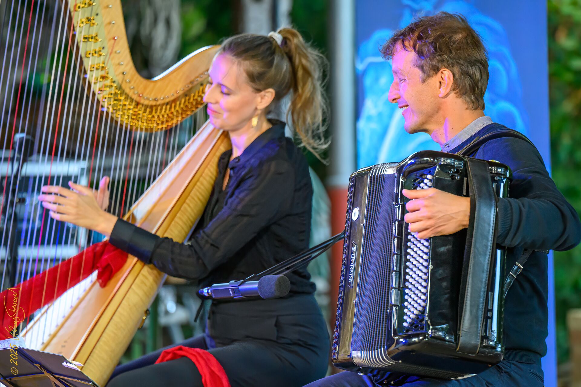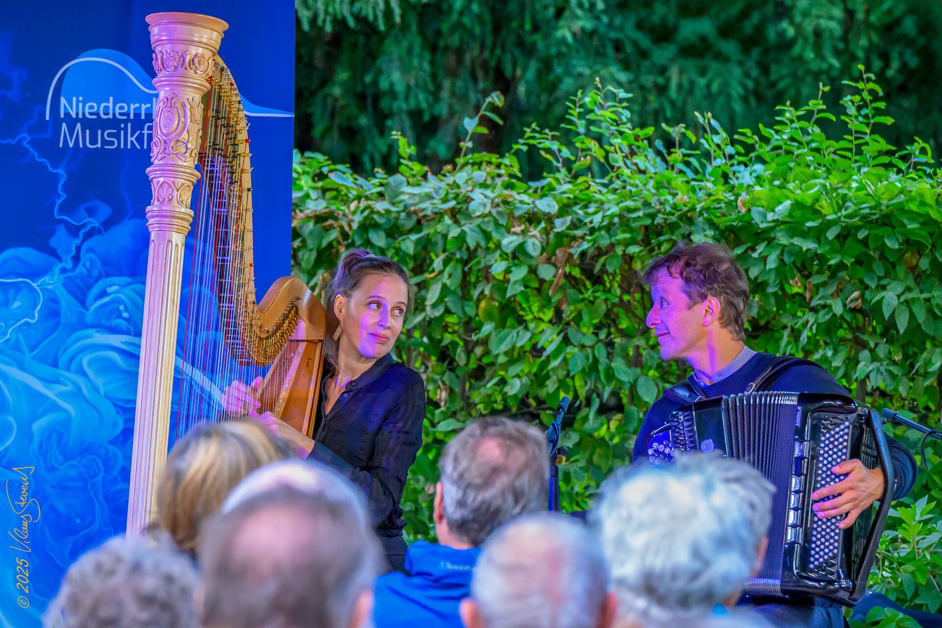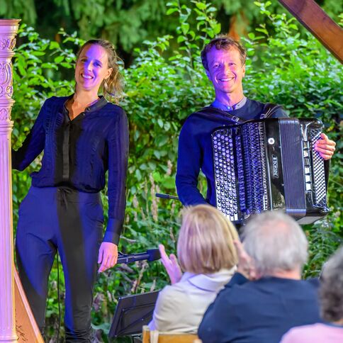 Über „ein volles Haus“ freuten sich Jürgen Rau, Geschäftsführer vom Museumsförderverein Tuppenhof und Anette Maiburg, künstlerische Leiterin vom Niederrhein Musikfestival, denn viele Gäste waren zum Konzert vom Duo Oxymoron gekommen und warteten bei bestem Spätsommerwetter auf den Auftritt der beiden Künstler im Bauerngarten. „Scented Rushes“ – "Duftendes Nichts" hieß das Programm und mit „schaurig-schöner“ Musik von Astor Piazzolla und Maurice Ravel und dem Zusammenspiel von Harfe und Akkordeon in „klirrender Stille“ begeisterten Anna Steinkogler und Valentin Butt und machten ihrem Namen alle Ehre. Seit Jahren verbindet die beiden eine enge musikalische Beziehung und der Wunsch etwas intensiv Emotionales zu schaffen. Das ist ihnen gelungen, im Schein des Mondlichts bei „leuchtender Dunkelheit“ verschmolzen Klang und Stille zu einem einzigen „unendlichen Moment“ und zu einem klanglichen Dialog der beiden Instrumente und offenbarten so den Weg zu neuen Hörgewohnheiten (bh).