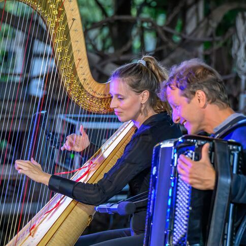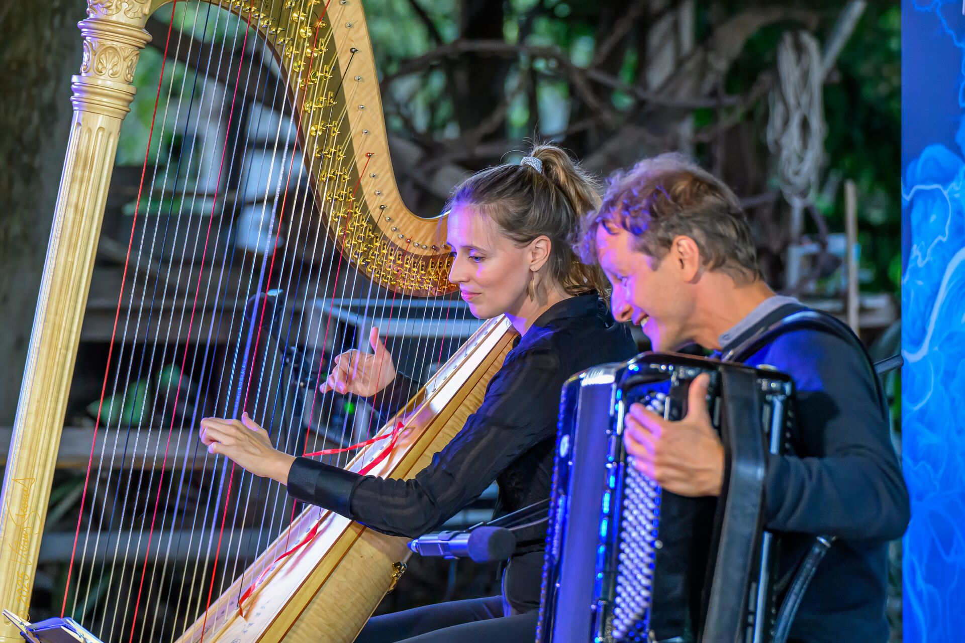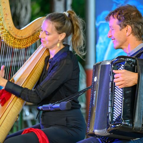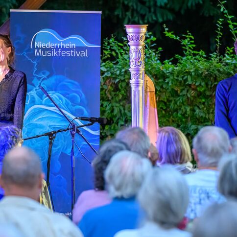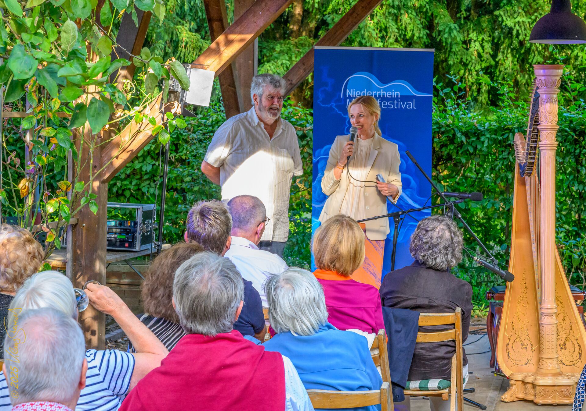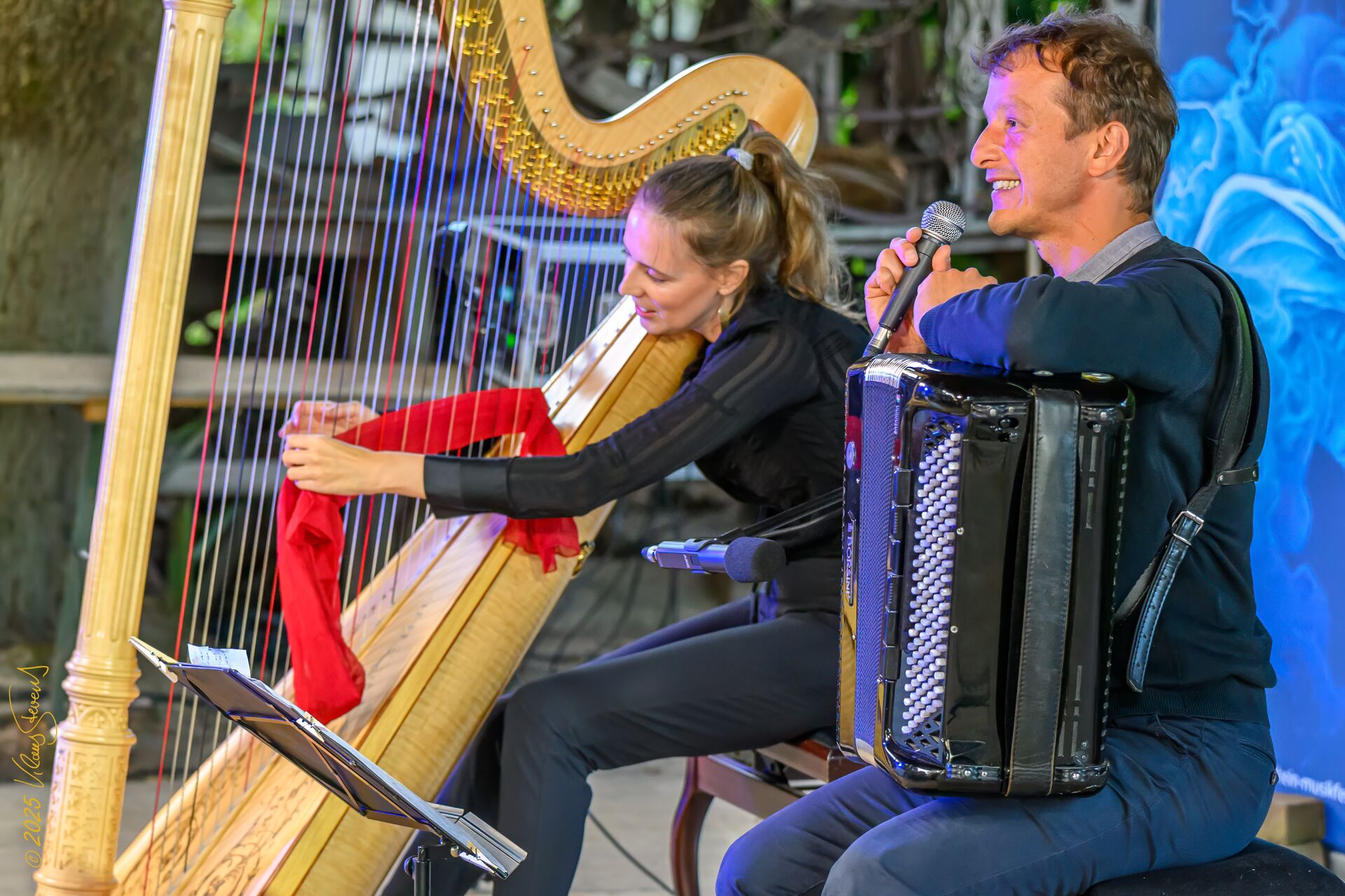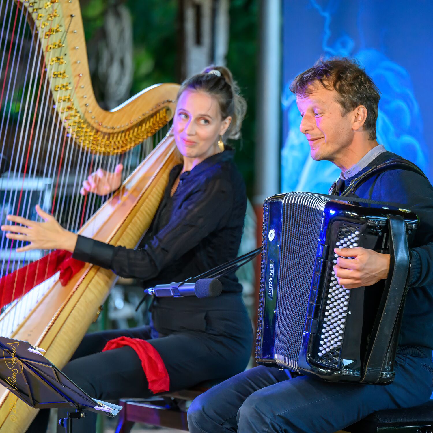 Über „ein volles Haus“ freuten sich Jürgen Rau, Geschäftsführer vom Museumsförderverein Tuppenhof und Anette Maiburg, künstlerische Leiterin vom Niederrhein Musikfestival, denn viele Gäste waren zum Konzert vom Duo Oxymoron gekommen und warteten bei bestem Spätsommerwetter auf den Auftritt der beiden Künstler im Bauerngarten. „Scented Rushes“ – "Duftendes Nichts" hieß das Programm und mit „schaurig-schöner“ Musik von Astor Piazzolla und Maurice Ravel und dem Zusammenspiel von Harfe und Akkordeon in „klirrender Stille“ begeisterten Anna Steinkogler und Valentin Butt und machten ihrem Namen alle Ehre. Seit Jahren verbindet die beiden eine enge musikalische Beziehung und der Wunsch etwas intensiv Emotionales zu schaffen. Das ist ihnen gelungen, im Schein des Mondlichts bei „leuchtender Dunkelheit“ verschmolzen Klang und Stille zu einem einzigen „unendlichen Moment“ und zu einem klanglichen Dialog der beiden Instrumente und offenbarten so den Weg zu neuen Hörgewohnheiten (bh).