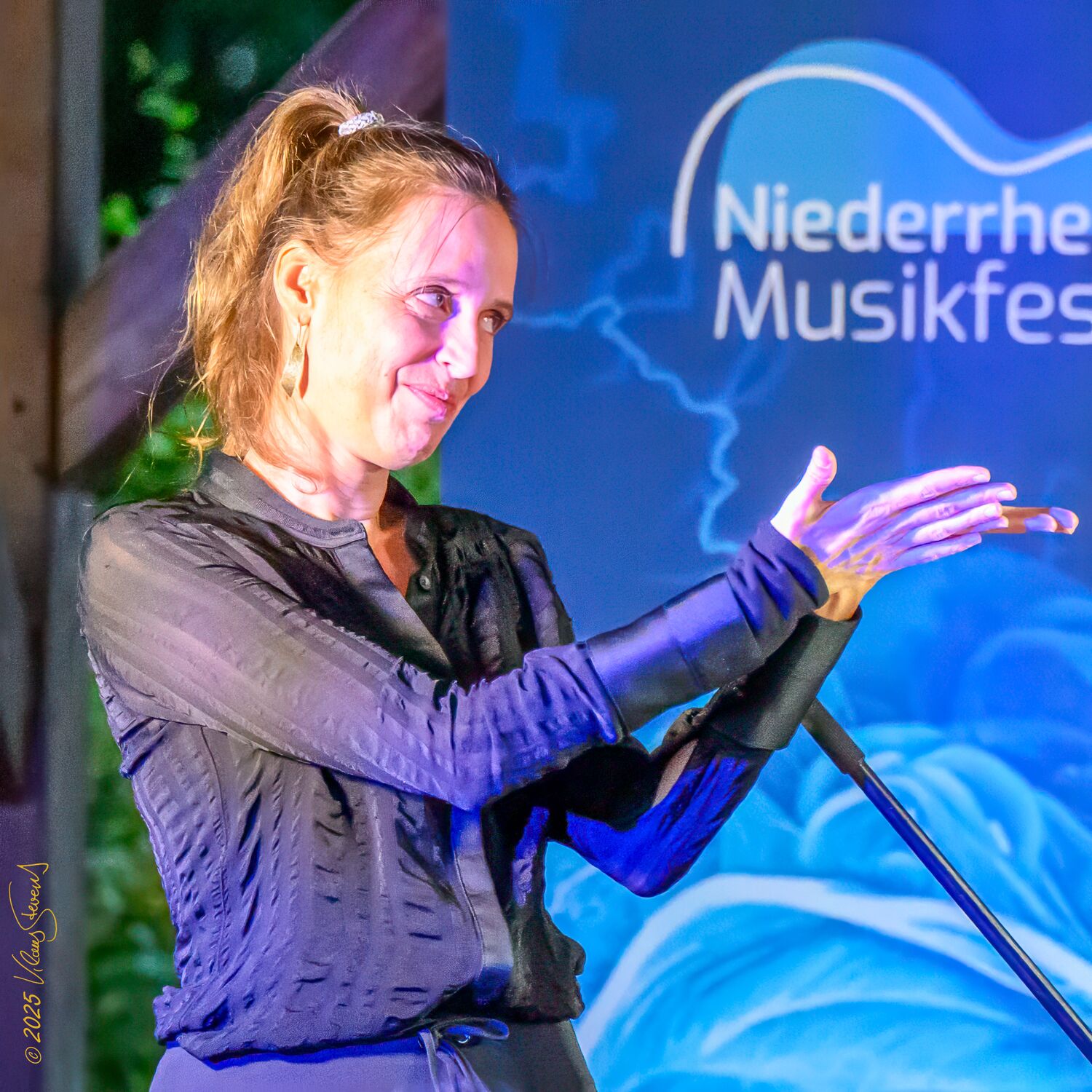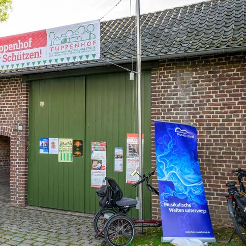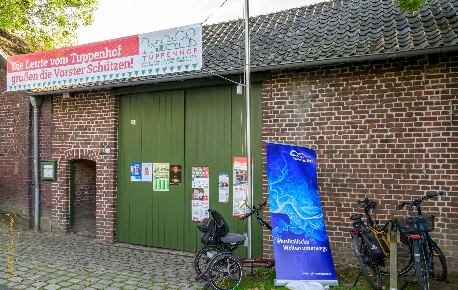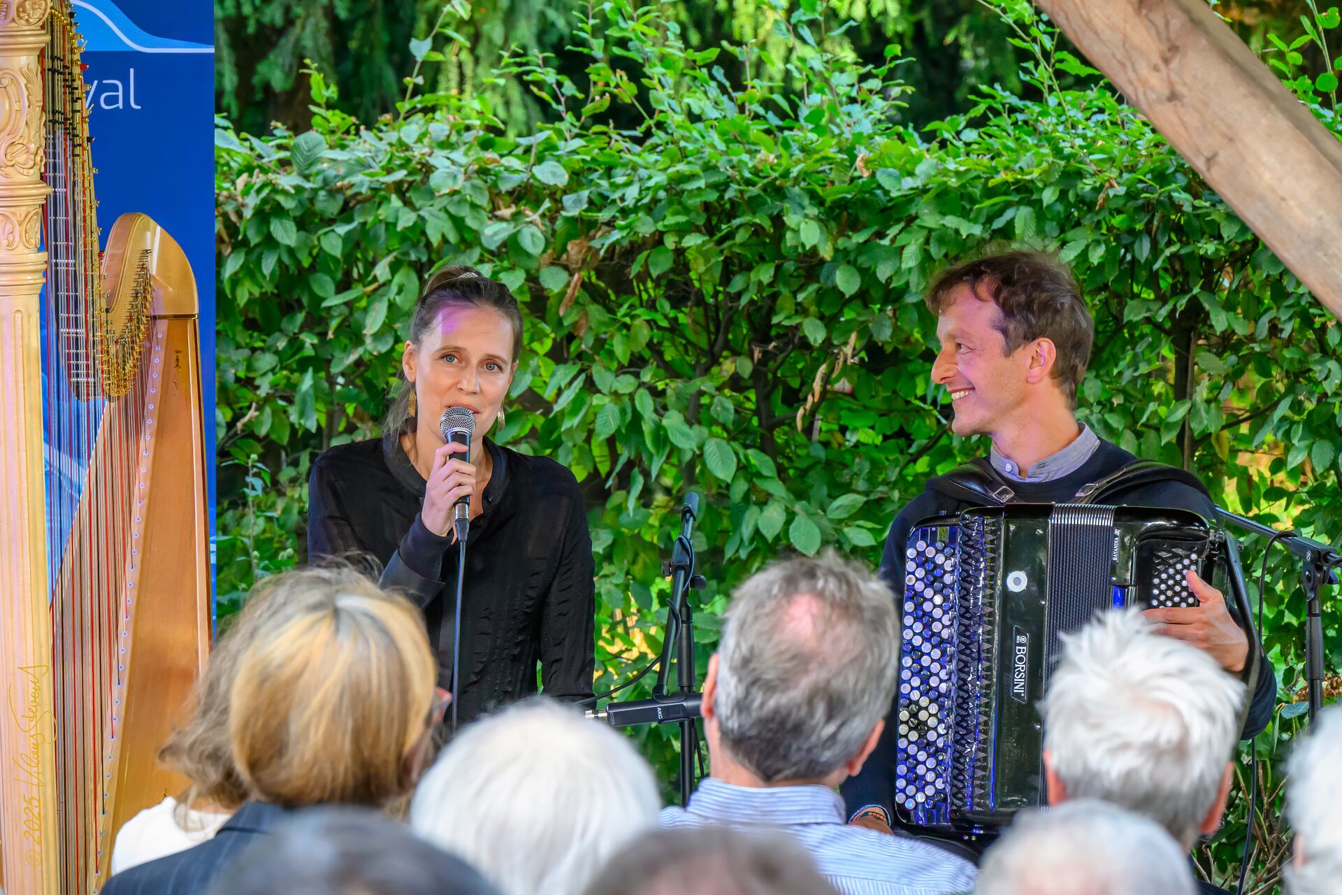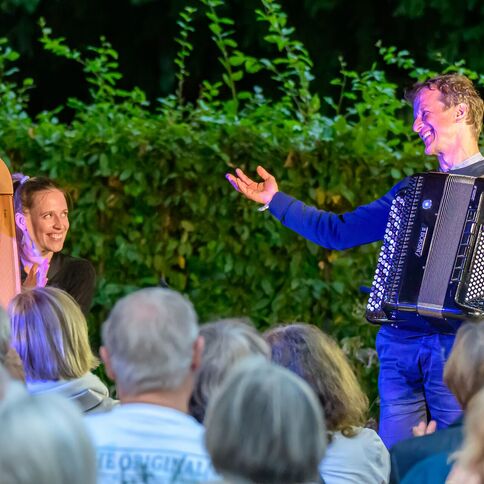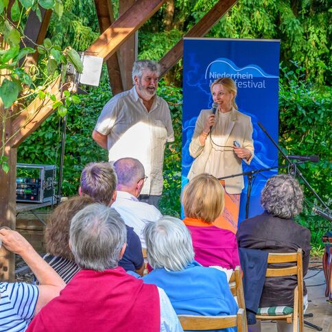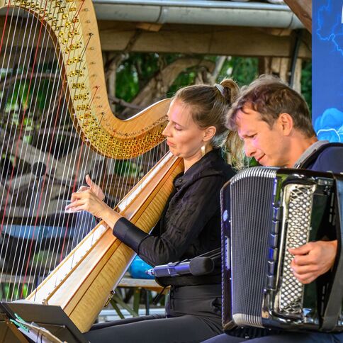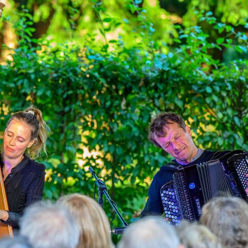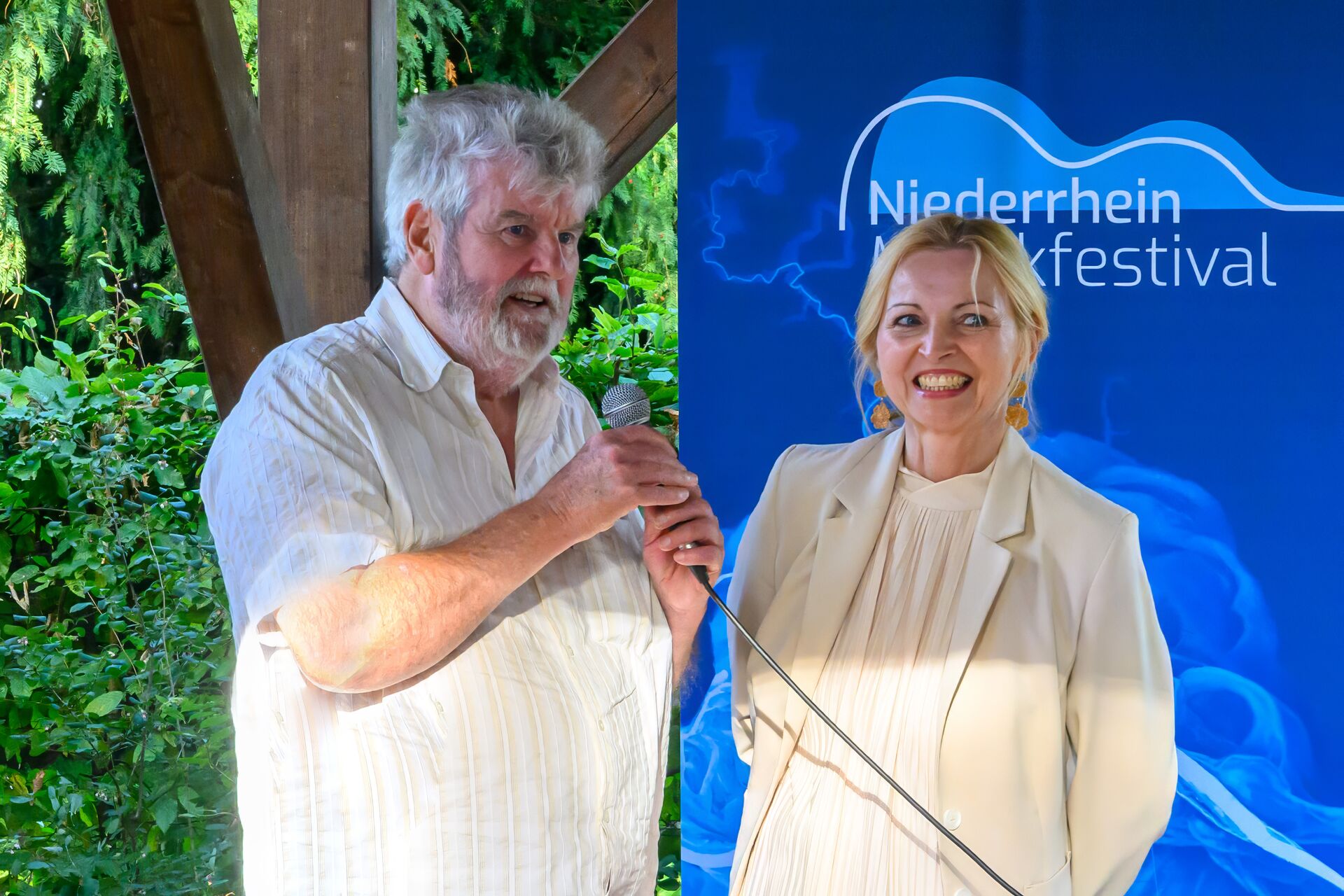 Über „ein volles Haus“ freuten sich Jürgen Rau, Geschäftsführer vom Museumsförderverein Tuppenhof und Anette Maiburg, künstlerische Leiterin vom Niederrhein Musikfestival, denn viele Gäste waren zum Konzert vom Duo Oxymoron gekommen und warteten bei bestem Spätsommerwetter auf den Auftritt der beiden Künstler im Bauerngarten. „Scented Rushes“ – "Duftendes Nichts" hieß das Programm und mit „schaurig-schöner“ Musik von Astor Piazzolla und Maurice Ravel und dem Zusammenspiel von Harfe und Akkordeon in „klirrender Stille“ begeisterten Anna Steinkogler und Valentin Butt und machten ihrem Namen alle Ehre. Seit Jahren verbindet die beiden eine enge musikalische Beziehung und der Wunsch etwas intensiv Emotionales zu schaffen. Das ist ihnen gelungen, im Schein des Mondlichts bei „leuchtender Dunkelheit“ verschmolzen Klang und Stille zu einem einzigen „unendlichen Moment“ und zu einem klanglichen Dialog der beiden Instrumente und offenbarten so den Weg zu neuen Hörgewohnheiten (bh).