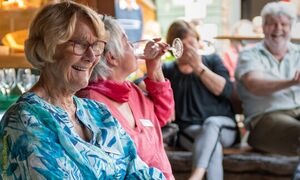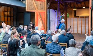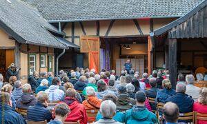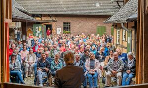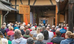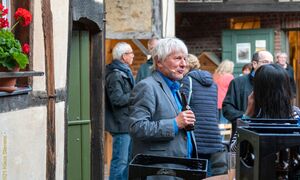 Denn sowohl die Zuwegung als auch der Rasen vor der Remise waren völlig aufgeweicht. Also hieß es für die Ehrenamtler 132 Stühle ab- und im Innenhof wieder aufbauen, wobei alle nach der vorgegeben Nummerierung gestellt werden mussten. Was dann eigentlich niemand so recht geglaubt hatte - bis auf einige wenige Daueroptimisten - trat dann aber tatsächlich ein: als gegen 18:30 Uhr die ersten Besucher eintrafen, hatte nicht nur der Regen aufgehört, sondern gelegentlich schien sogar die Sonne. Mit einem Satz gesagt: bestes Open-Air-Event-Wetter im Tuppenhof.