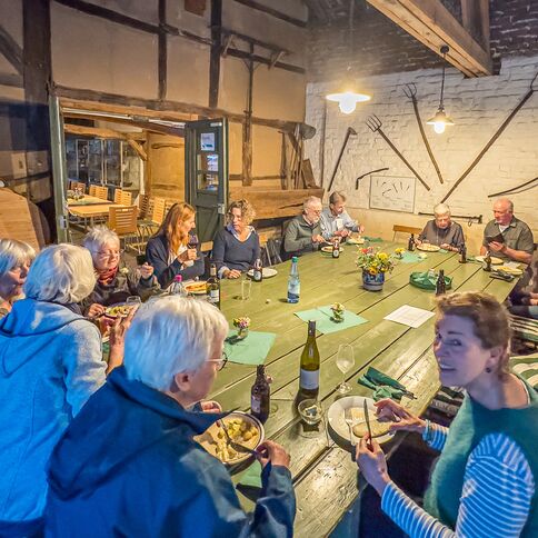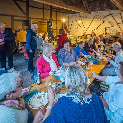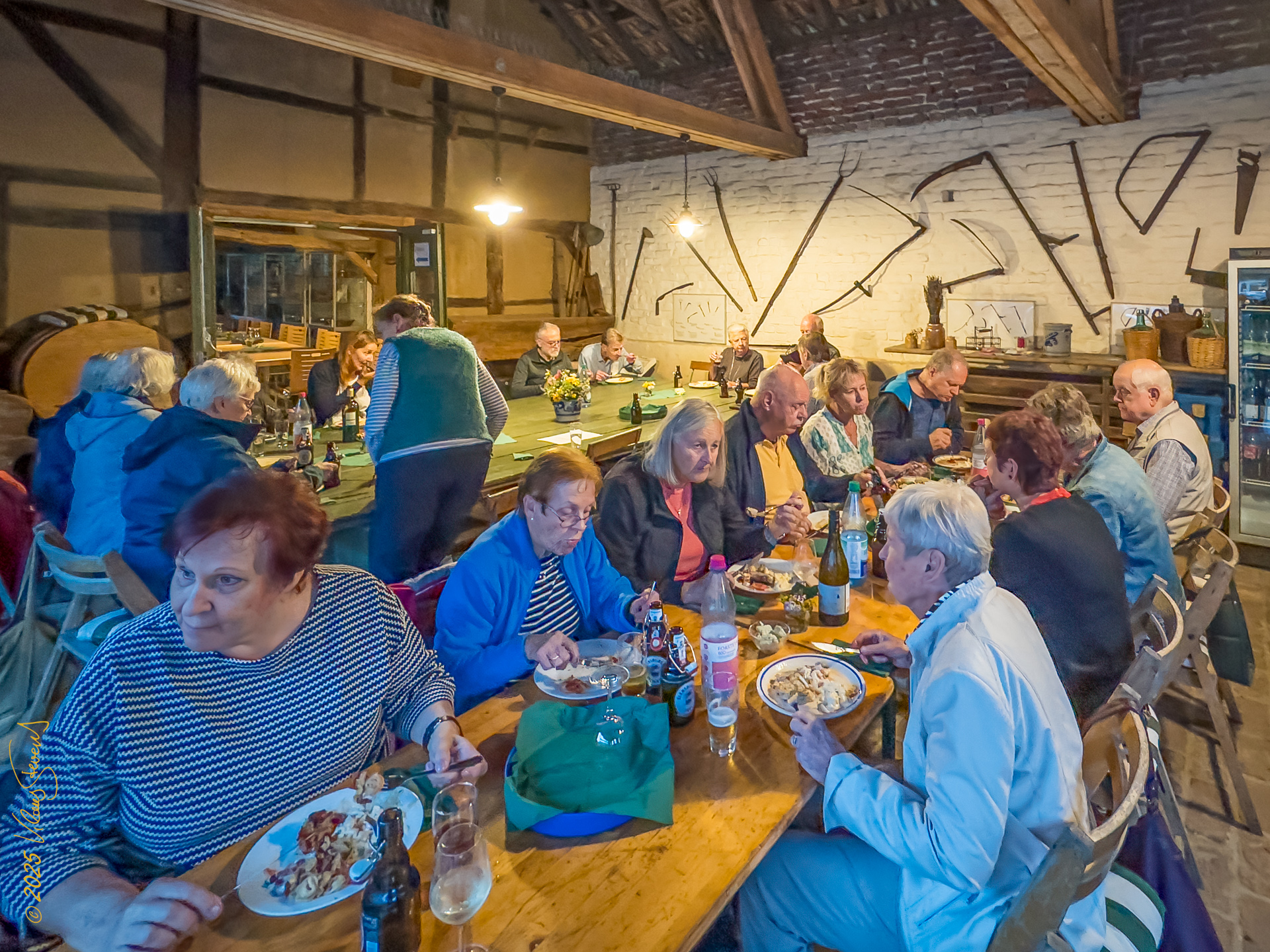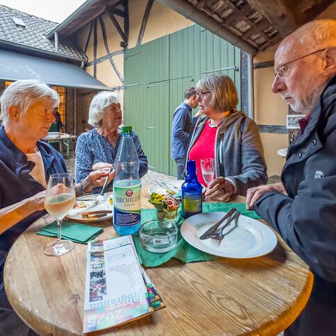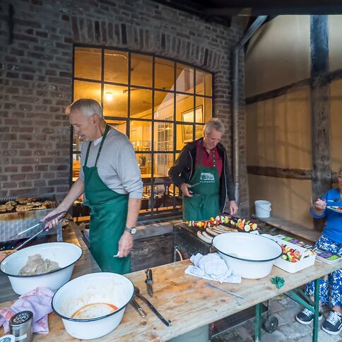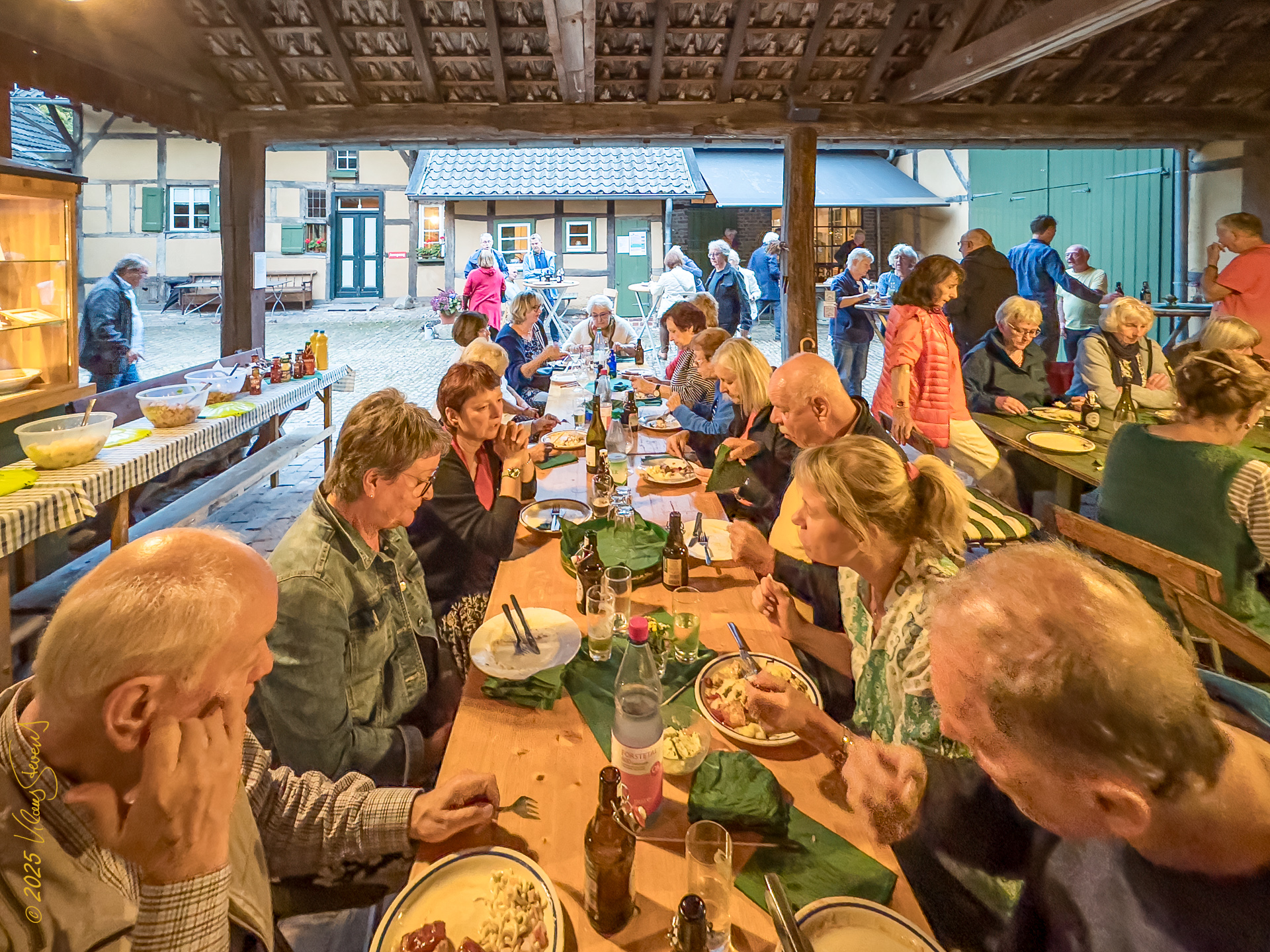 Nach dem abschließenden Dank für die geleistete Arbeits des Ehrenamtlerteams ging es dann zum Grillfest im Hof der denkmalsgeschützten Hofanlage, wo Gabi Heimes schon eine ansehnliche Salatbar aufgebaut hatte und Ecki Ebenhöch und Jürgen Löwe ihre Kunst als Grillmeister unter Beweis stellten.