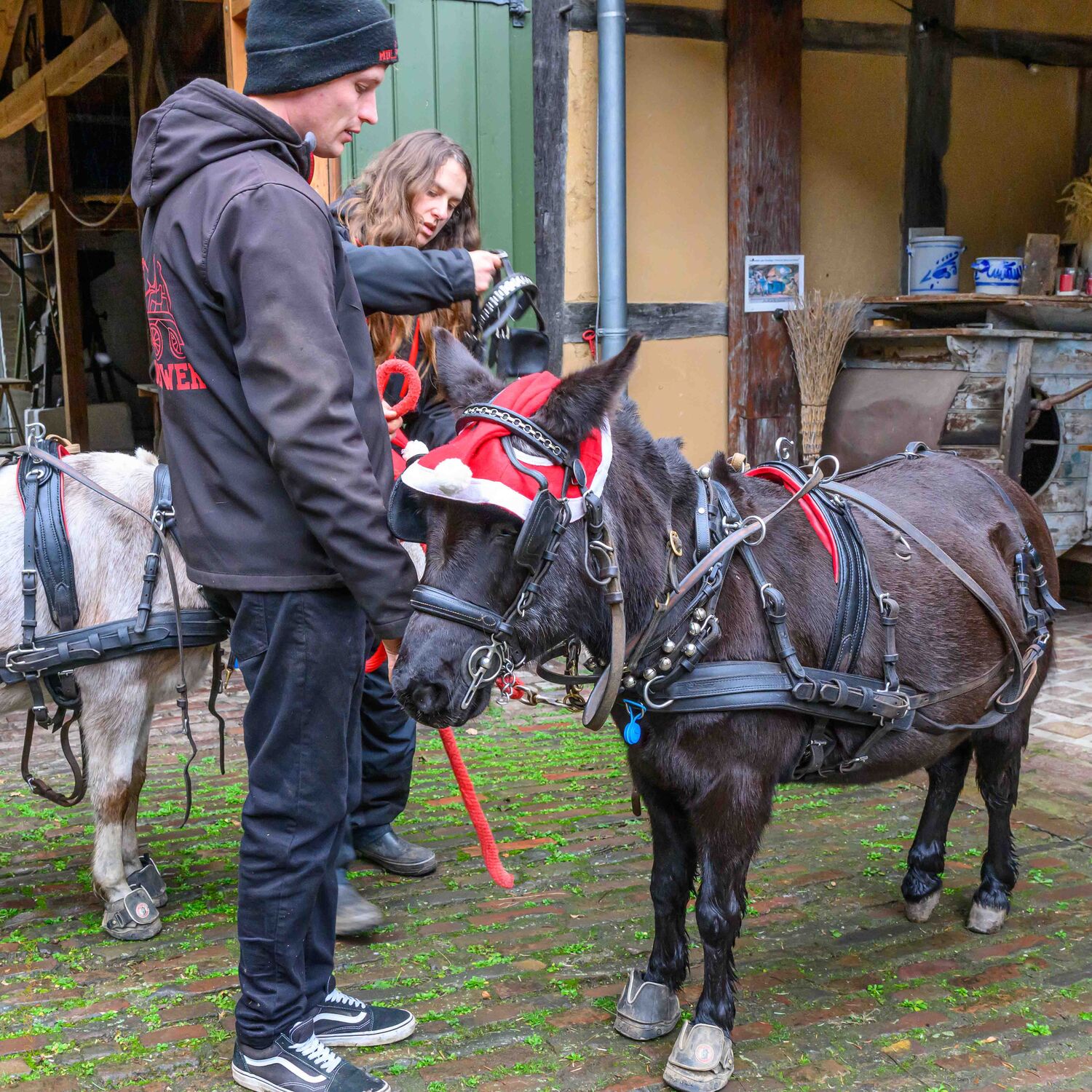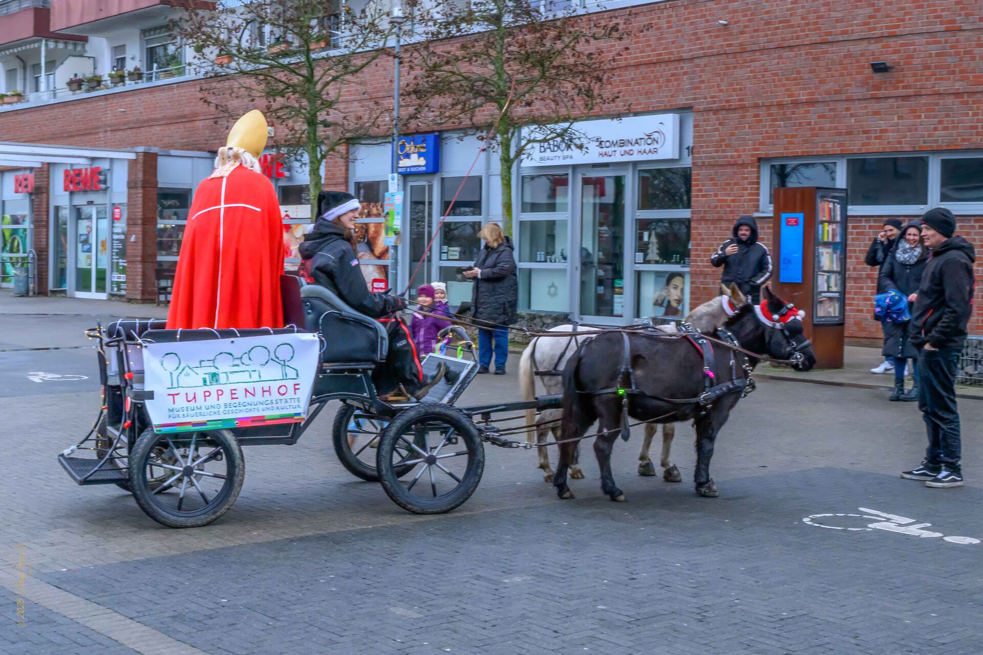 Die Nikolaus-Kutschfahrt durch Kaarst-Vorst ist eine beliebte vorweihnachtliche Tradition, die besonders Familien und Kinder begeistert. Wie immer war der Start am Tuppenhof und weitere Stationen waren dann die Raiffeisenbank, der St.-Eustachius-Platz, der Postkiosk sowie die Antoniuskapelle. Doch bevor es losging, mussten erstmal die Mulis Anne und Gerrit vor die kleine Kutsche gespannt werden. Da die Eltern ein Esel und ein Pony waren, sind die beiden mit einer Schulterhöhe von gerade einmal 90 cm deutlich kleiner als ein Esel. Das fanden natürlich vor allem die Kinder toll, denn gestreichelt werden durften die beiden auch.